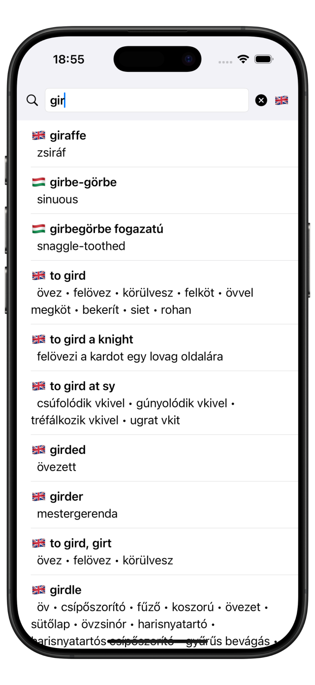 Simple and offline English-, German-, French-, Italian-, Spanish-, Portuguese-, Swedish-, Finnish-, Dutch-, Czech-, Croatian-, Romanian-, Slovakian-, Polish-, Norwegian-, Turkish-Hungarian dictionary.